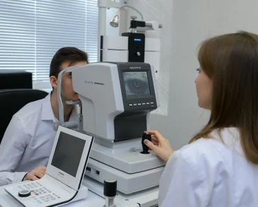 - Диагностика зрения, консультация офтальмолога. Врач проводит комплексную проверку зрения на современном оборудовании, которая должна длиться от 30 до 60 минут. Выписка правильного рецепта требует комплексного подхода. Помимо стандартной проверки по таблице, необходимо провести углубленное обследование, включающее диагностику аккомодации — способности глаз фокусироваться на разном расстоянии — и оценку бинокулярного зрения, то есть слаженной работы обоих глаз, обеспечивающей объемное восприятие мира. Без этих данных рецепт будет неполным. Нарушения аккомодации могут маскировать истинную степень близорукости или дальнозоркости, а скрытые проблемы с бинокулярным зрением приведут к тому, что в новых очках вы будете испытывать дискомфорт, головные боли и напряжение. Только полная диагностика позволяет подобрать не только корригирующие линзы, но и назначить оптимальный вид коррекции — будь то обычные очки, прогрессивные линзы или контактная коррекция, — которая обеспечит длительный комфорт и сохранит здоровье ваших глаз.